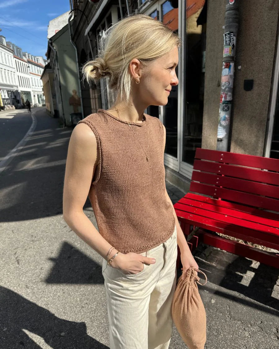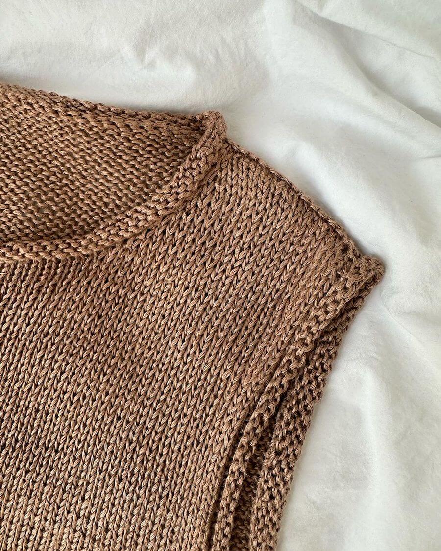 Materialer: 250 (250) 300 (300) 350 (400) 450 (450-500) 500 (500) g Hør Organic fra Isager Yarn (50 g = 178 m) eller Trio 2 fra Isager Yarn (50 g = 175 m) eller 200 (200) 250 (250) 300 (350) 350-400 (400) 450 (450) g Tynn Line fra Sandnes Garn (50 g = 220 m) eller 200 (200) 250 (250) 250 (300) 300-350 (350) 400 (400) g Pure Silk fra Knitting for Olive (50 g = 250 m). Bemærk, at der strikkes med dobbelttråd. Garnforbruget angiver det totale garnforbrug.