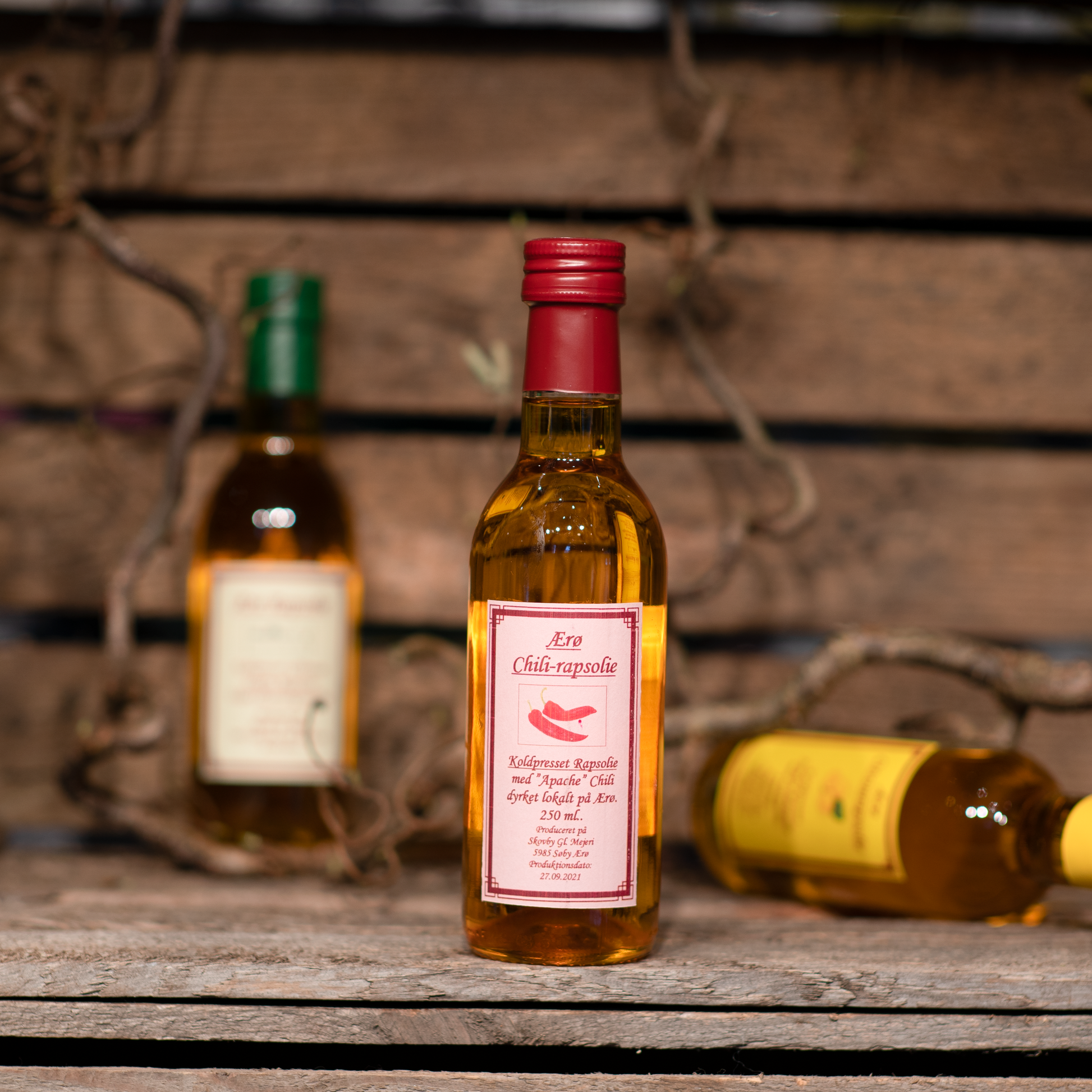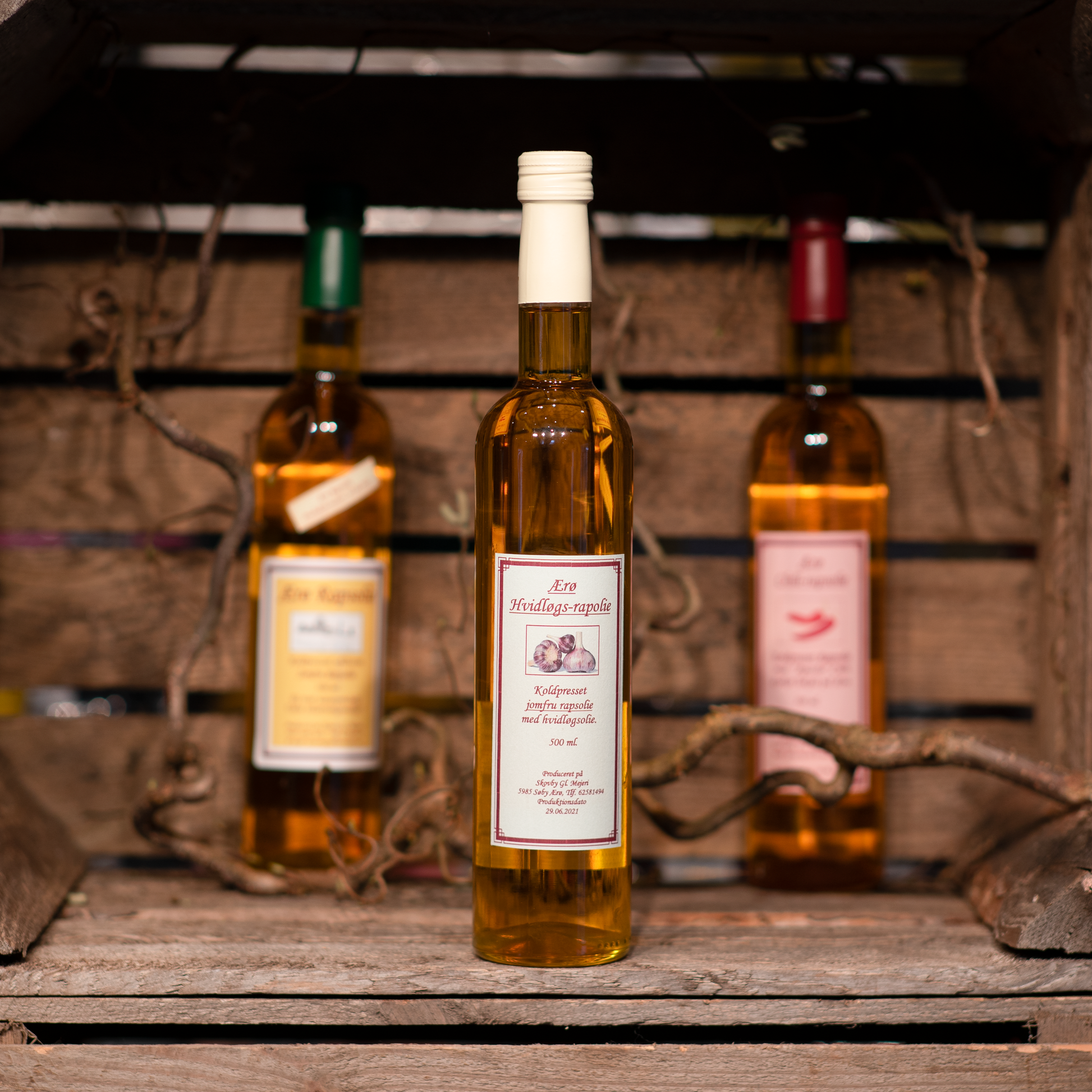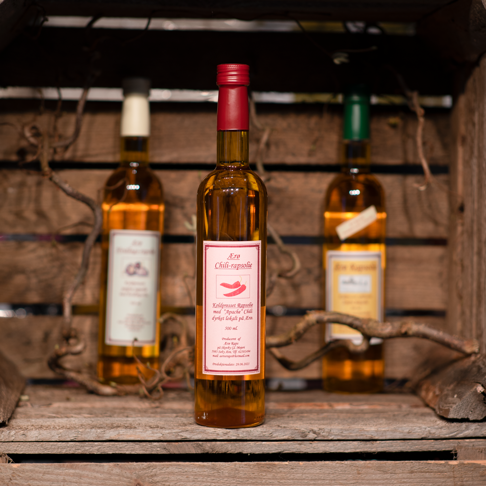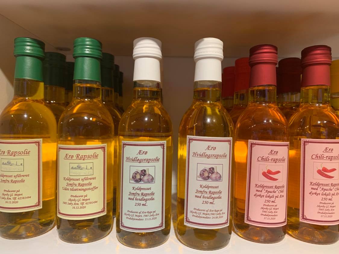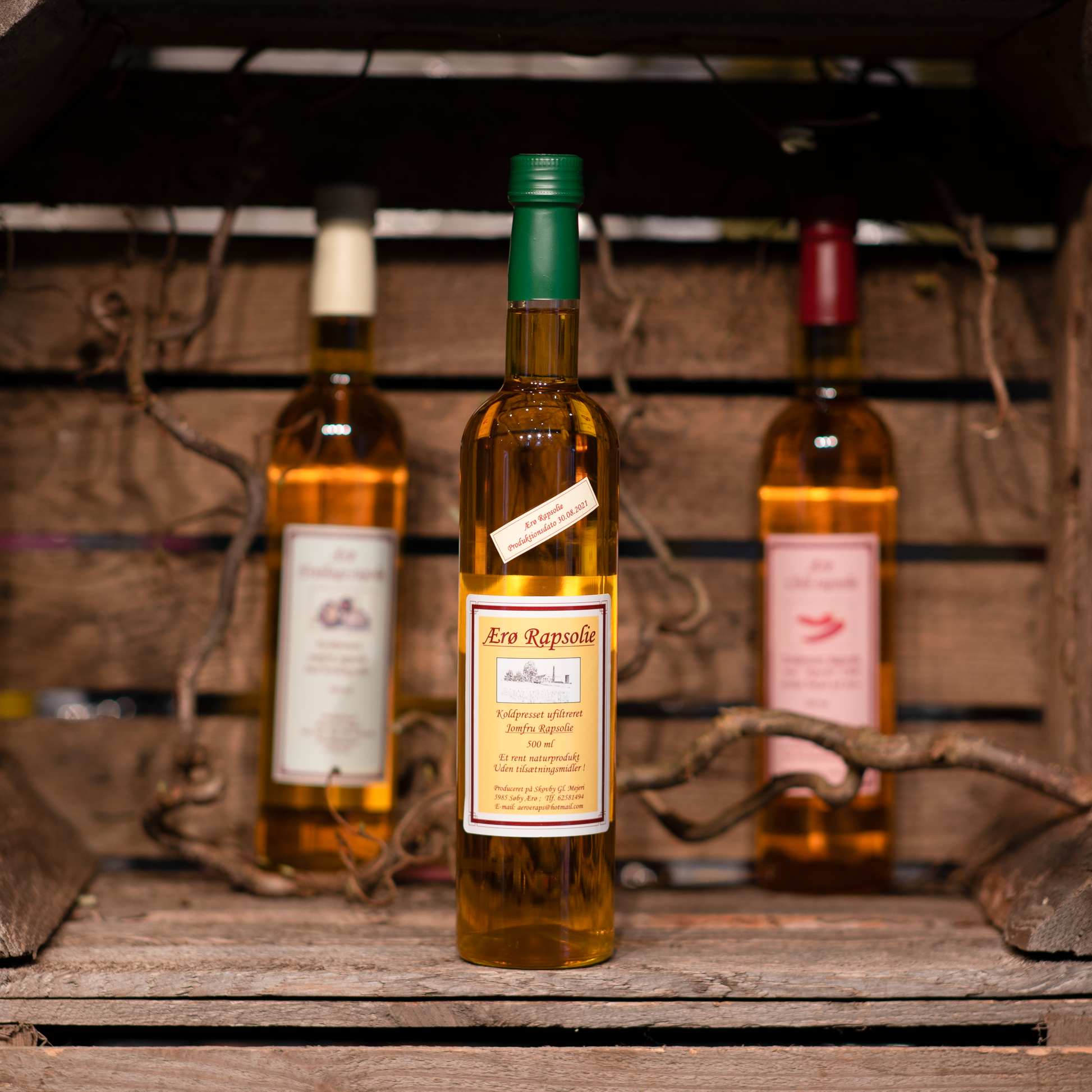 Ærø Raps verwandelt die wunderschönen Felder in ein wunderschönes kaltgepresstes Rapsöl, entweder neutral oder mit verschiedenen Gewürzen.