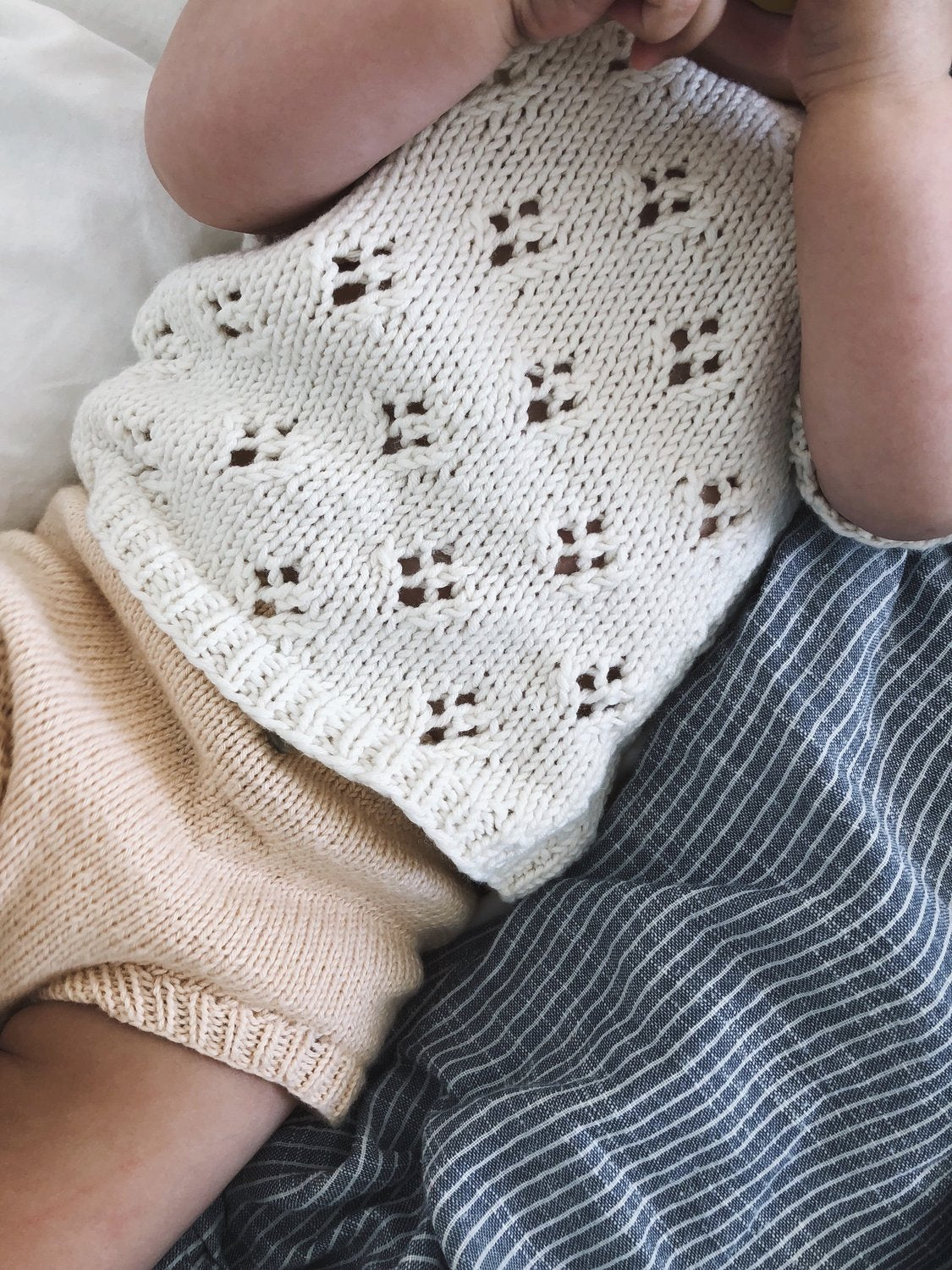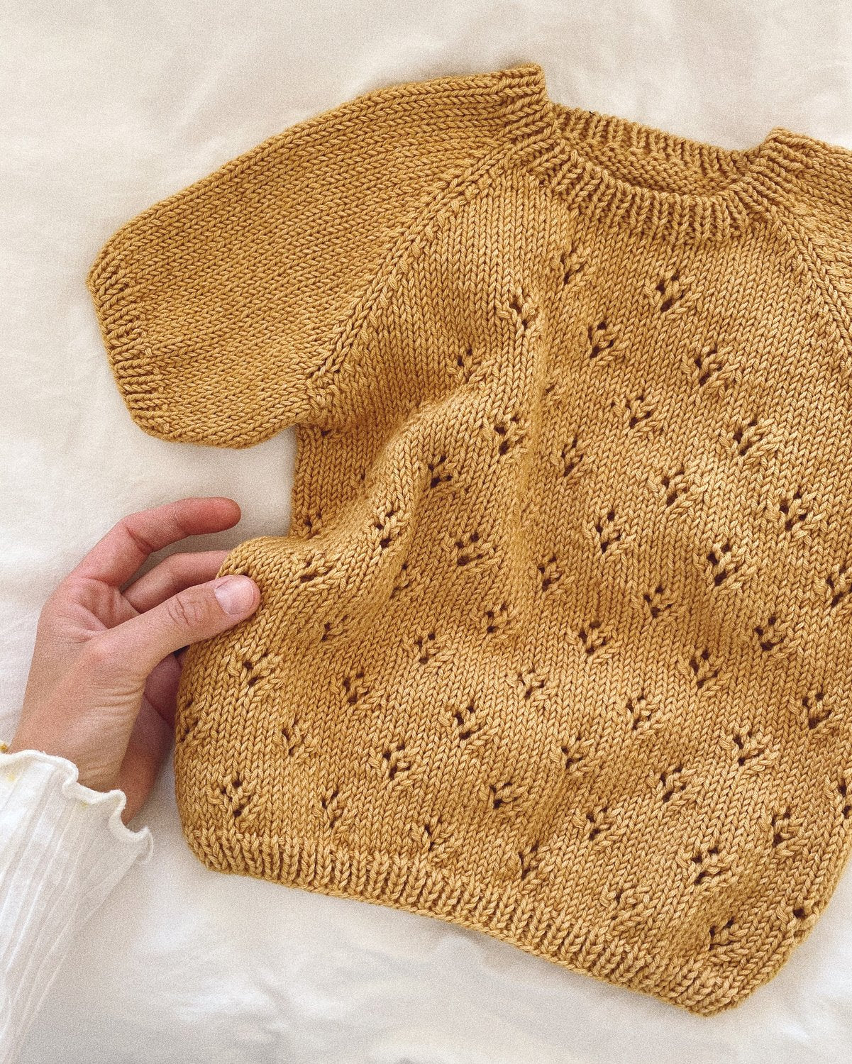 Rigmors Sommerbluse ist eine schöne Bluse, die auf der Rundnadel von unten nach oben mit Raglaneinsätzen gestrickt wird. Die Ärmel werden in Runden auf dem Nadelspiel gestrickt. Der Ausschnitt wird mit Drehnadeln geformt. Um einen dauerhaften Sitz am Hals zu erreichen. Entlang des Halsausschnitts kann ein dünner Gummifaden angenäht werden. Auf der Bluse befindet sich ein feminines und schlichtes Lochmuster.