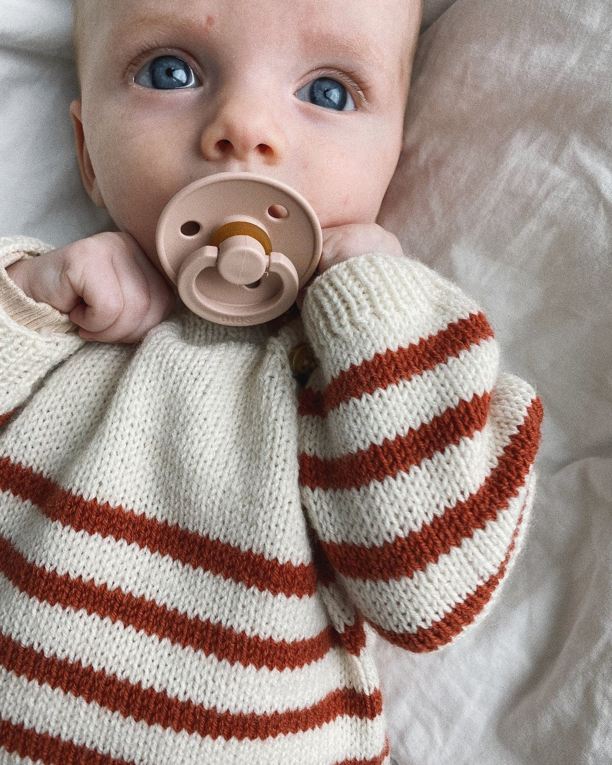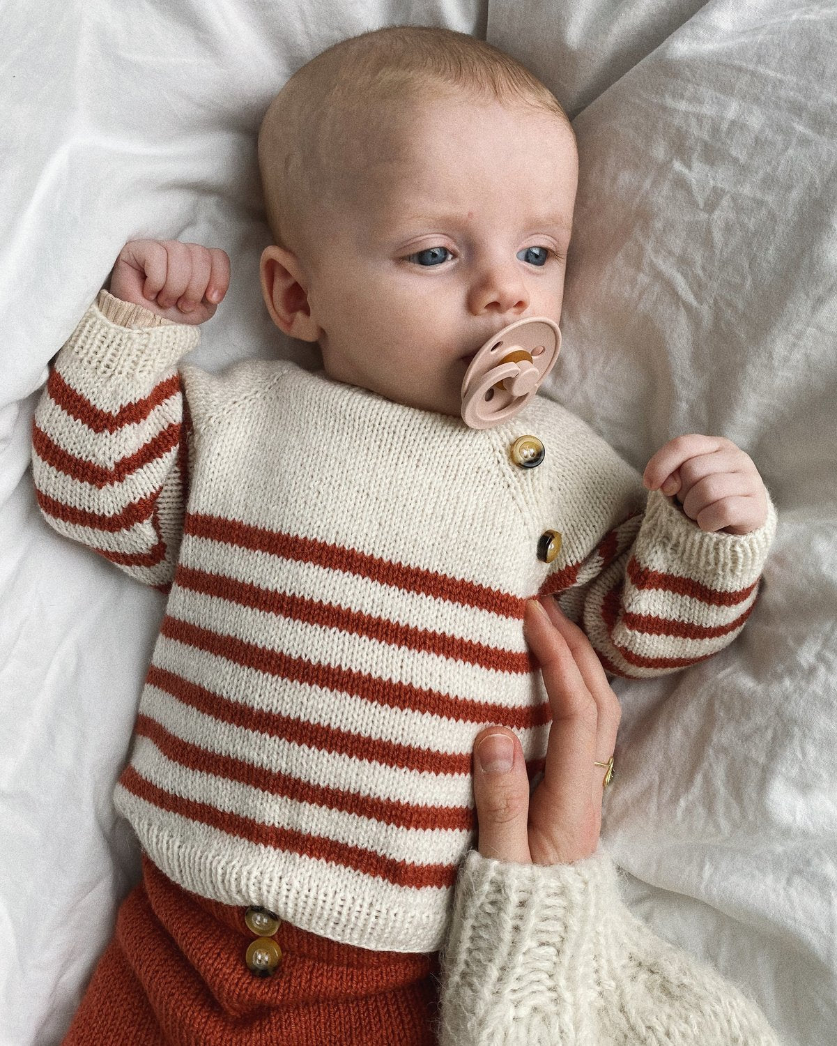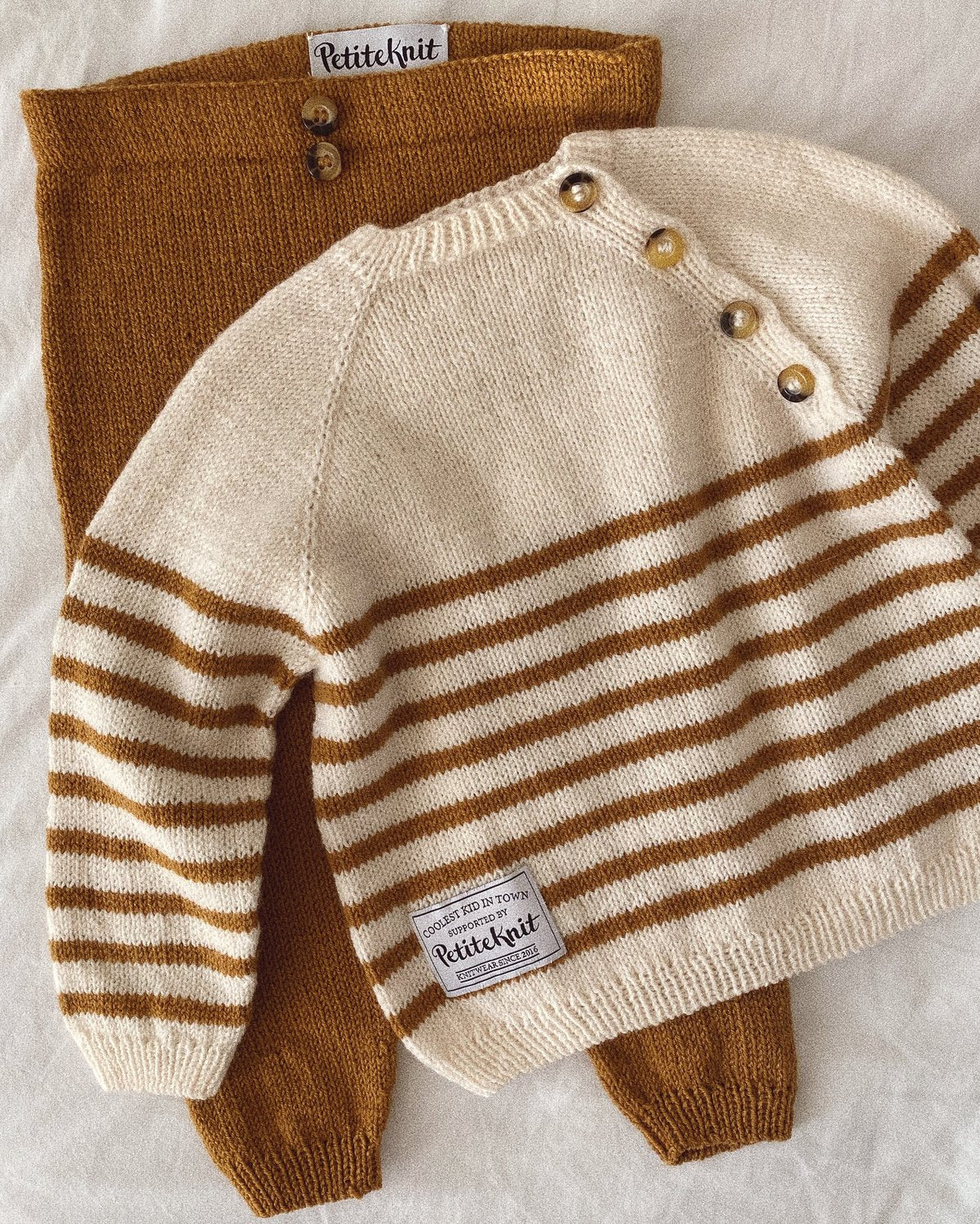 Die Bluse ist mit Streifen gestrickt. während die Hose einfarbig gestrickt ist.