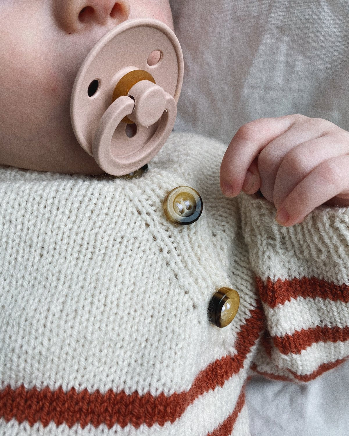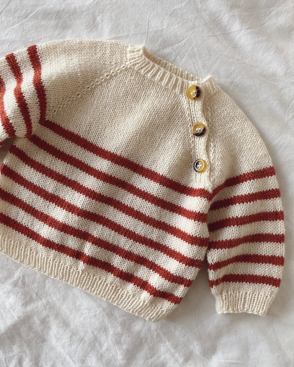 Bluse: 50 (50) 50-100 (100) 100 (100) 100 g Sunday von Sandnes Yarn (50 g = 235 m) für die untere Farbe der Bluse und 50 (50) 50 (50) 50 (50) 50 g Sunday von Sandnes Yarn (50 g = 235 m) für die Streifen der Bluse. Wenn fest, beträgt der Garnverbrauch 50 (50-100) 100 (100) 100 (100) 150 g Sonntag von Sandnes Garn (50 g = 235 m). 3 (3) 3 (3) 3 (4) 4 Knöpfe (ø = 12-13 mm)