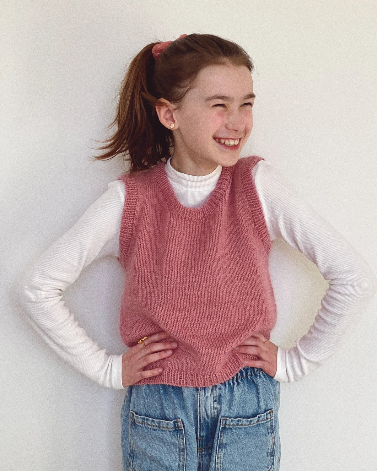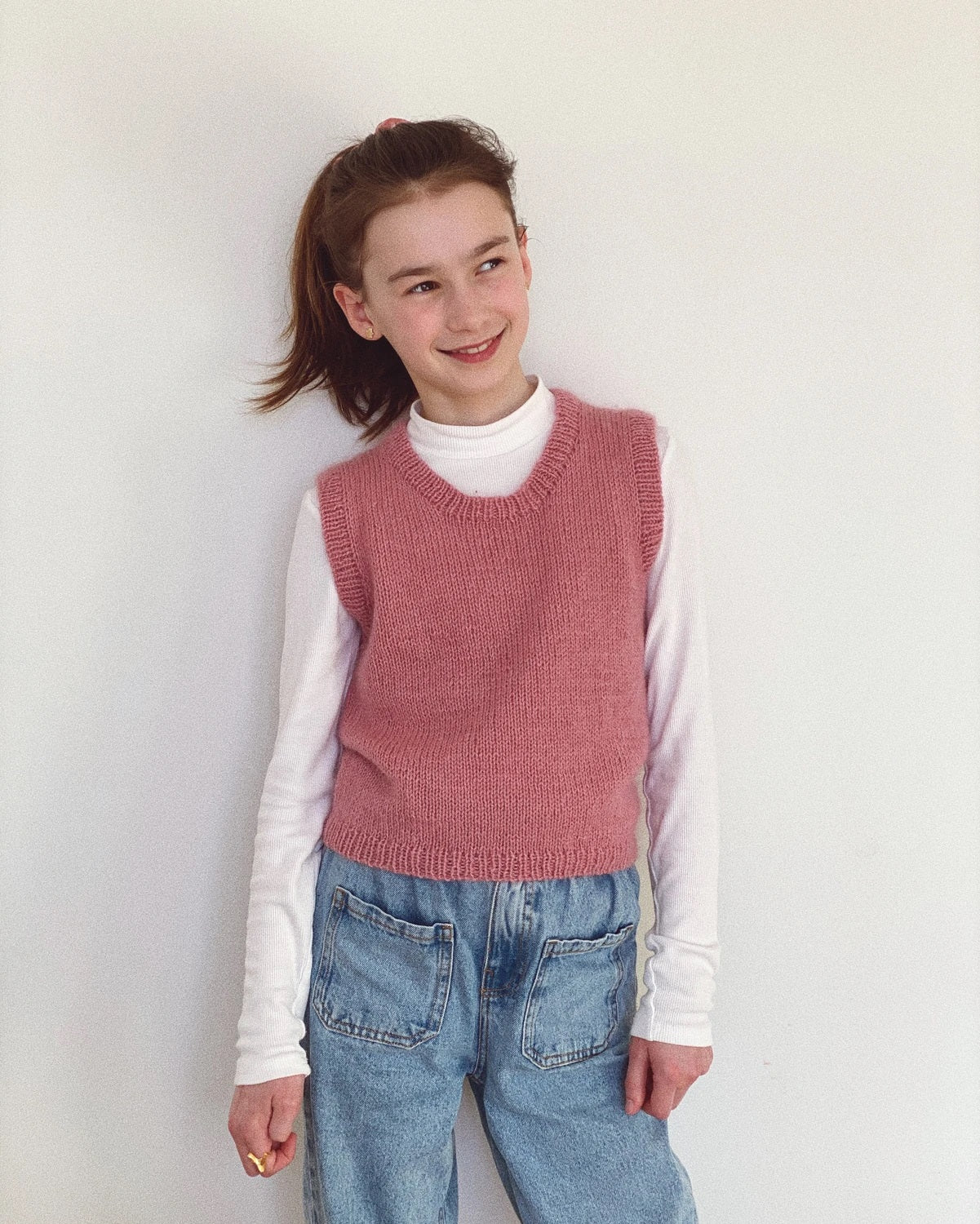 Stockholm Slipover Junior ist eine schöne Weste für Jungen und Mädchen. Es wird von oben nach unten gestrickt, was das Anprobieren während des Vorgangs und ggf. erleichtert verlängern. Stricken Sie zunächst das Rückenteil. dann Schultern und für das Stück und schließlich den Körper. Der Stockholm Slipover hat eine Schulterschräge, die mithilfe von Spannschlössern an den Schultern für eine gute Passform geformt wurde. Entlang des Halsausschnitts und der Armausschnitte Rippkanten stricken. der mit einem italienischen Schluss endet.