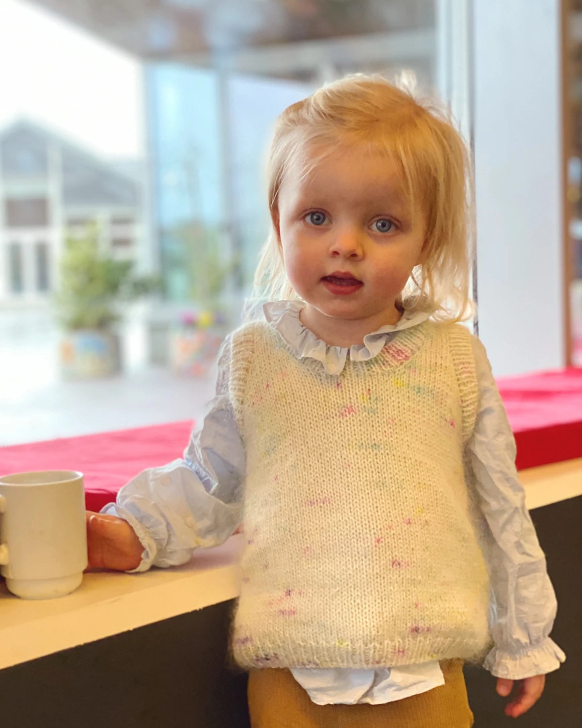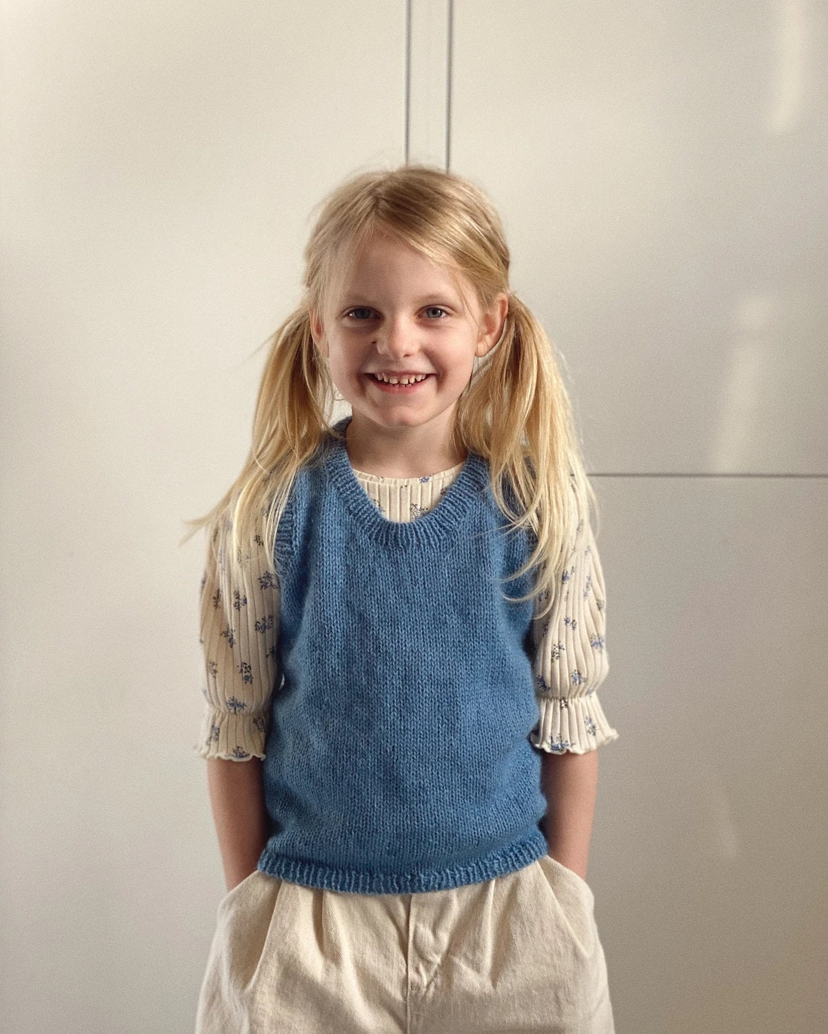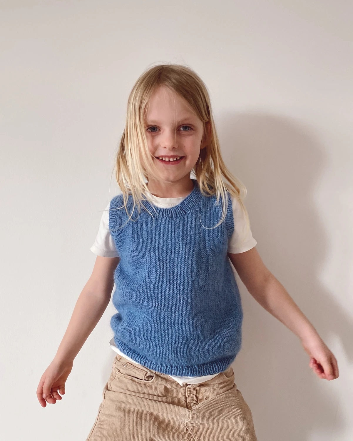 Stockholm Slipover Mini ist eine schöne Weste für Jungen und Mädchen. Es wird von oben nach unten gestrickt und lässt sich daher leicht in der Länge ändern. Zuerst das Rückenteil. dann Schultern und für das Stück und schließlich den Körper. Der Stockholm Slipover hat eine Schulterschräge, die mithilfe von Spannschlössern an den Schultern für eine gute Passform geformt wurde. Rippkanten entlang der Halsöffnung und der Armausschnitte stricken. der mit einem engen italienischen Verschluss abschließt.
