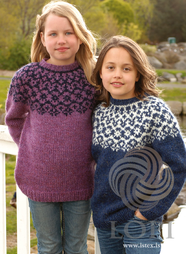 Él er en sweater til både piger og drenge. strikket med 2 tråde af den lette og bløde Plötulopi udspundet 100% islandsk uld også kendt som pladegarn. Èl strikkes nedefra og op på rundpinde.