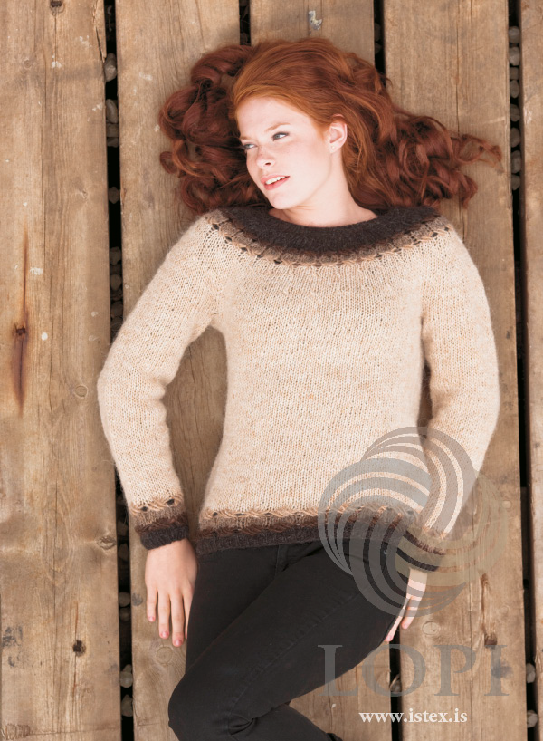 Flot og elegant Islandsk strik med et flot hulmønster. strikket nedefra og op med rundt bærestykke.