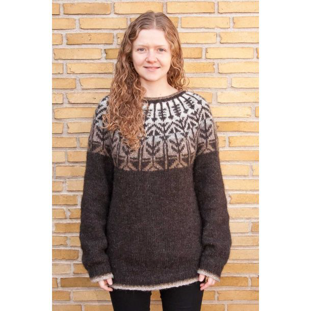 Anderledes smuk sweater fra Istex. strikket nedfra og op en et flot mønster på det runde bærestykke.