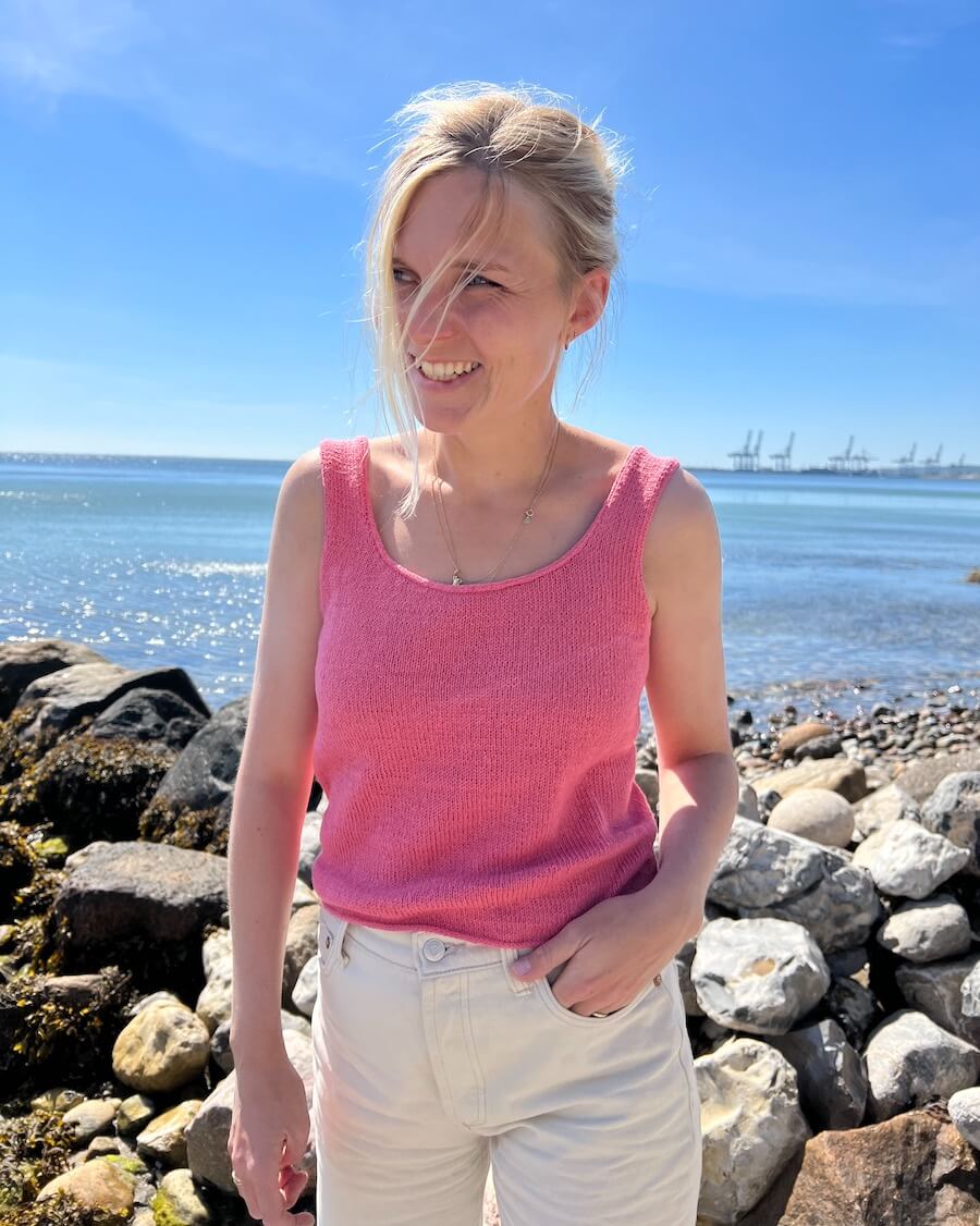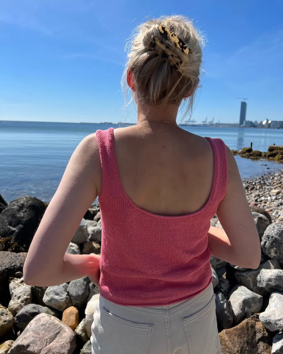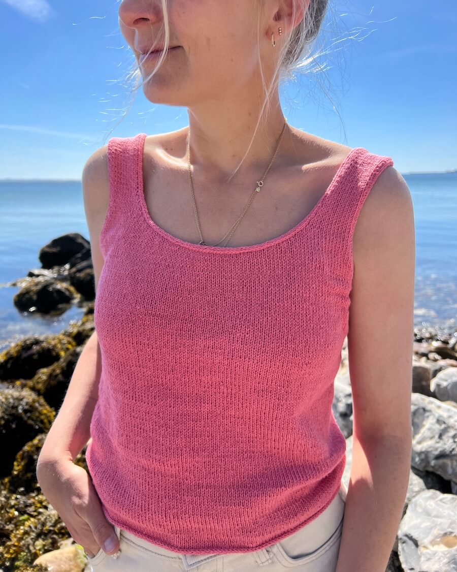 June Top Light er en fin sommertop der strikkes nedefra og op. Kroppen strikkes rundt i glatstrik, og arbejdet deles herefter i forstikke og ryg, der strikkes hver for sig, frem og tilbage i glatstrik. Opskriften indeholder desuden vejledning til at strikke toppen fra midten ved hjælp af midlertidigt opslag, så toppens endelige længde kan justeres til allersidst. June Top Light er designet således, at udskæringen er dybere på ryggen – men kun så dyb, at den stadig vil dække en bh. Langs alle kanter strikkes en smal i-cordkant.