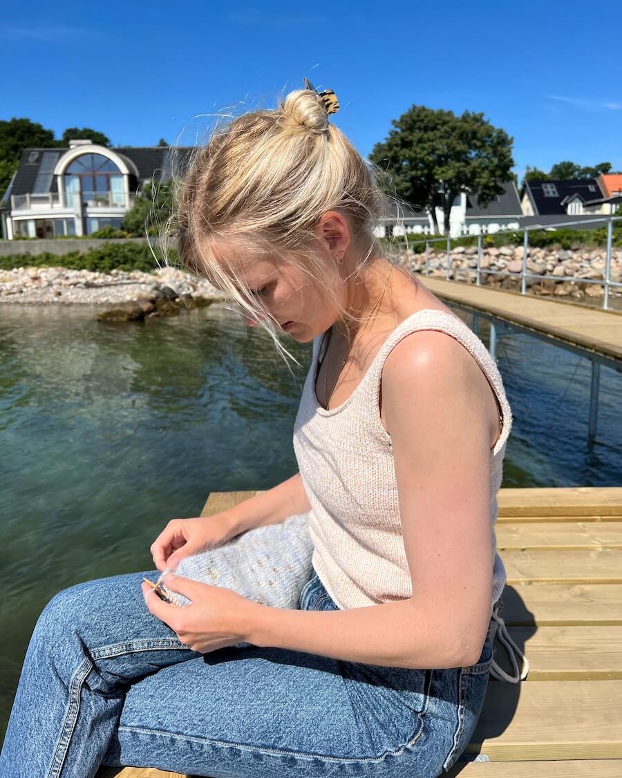 June Top er en skøn sommer top der strikkes nedefra og op. Kroppen strikkes rundt i glatstrik, og arbejdet deles herefter i for stykke og ryg, der strikkes hver for sig, frem og tilbage i glatstrik. Opskriften indeholder desuden vejledning til at strikke toppen fra midten ved hjælp af midlertidigt opslag, så toppens endelige længde kan justeres til allersidst. June Top er designet således, at udskæringen er dybere på ryggen – men kun så dyb, at den stadig vil dække en bh. Langs alle kanter strikkes en smal i-cordkant.