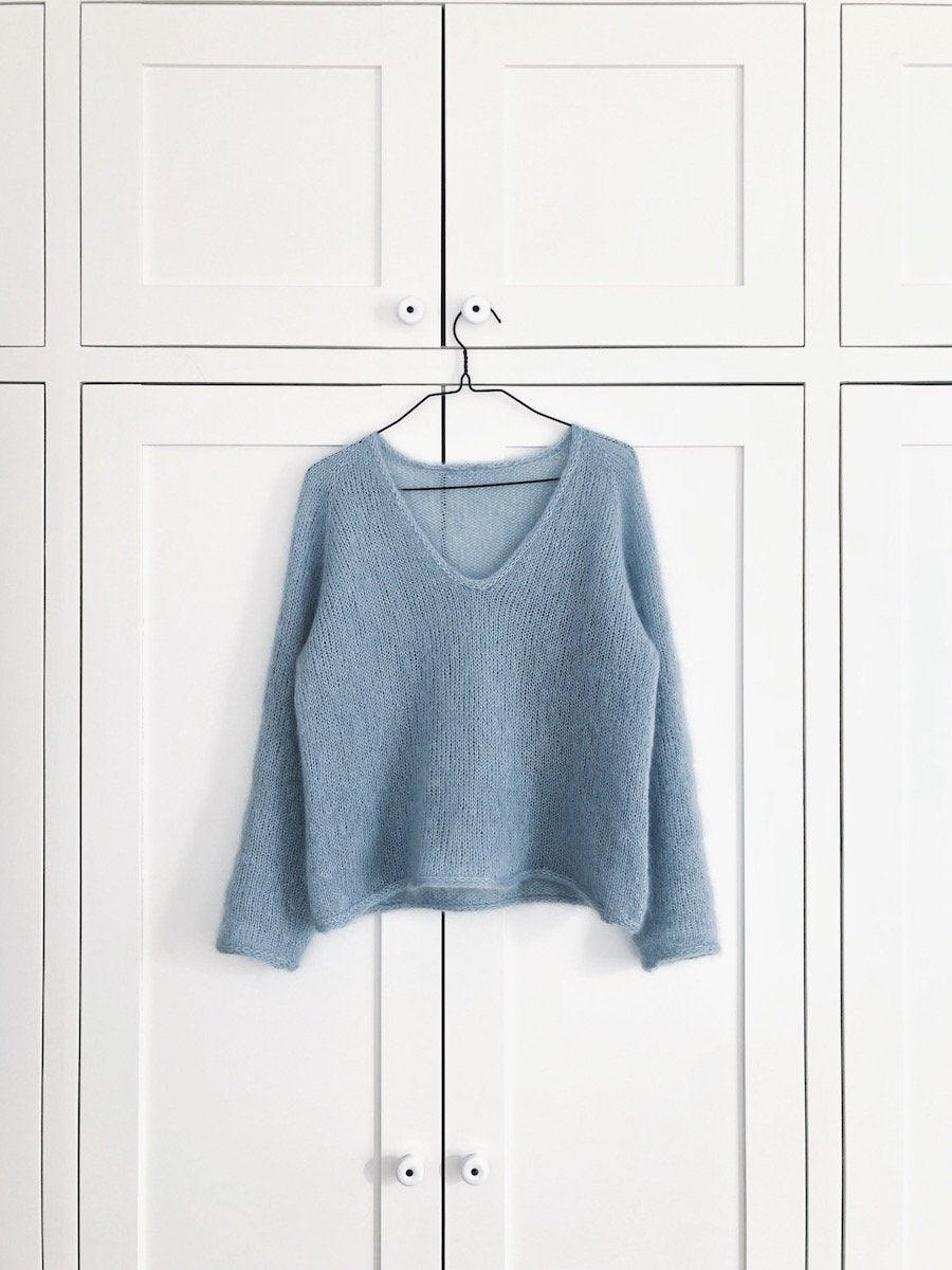 Kumulus Bluse strikkes i to tråde tyndt mohair/silkegarn i glatstrik oppefra og ned. Blusen har en dyb. afrundet V-udskæring.