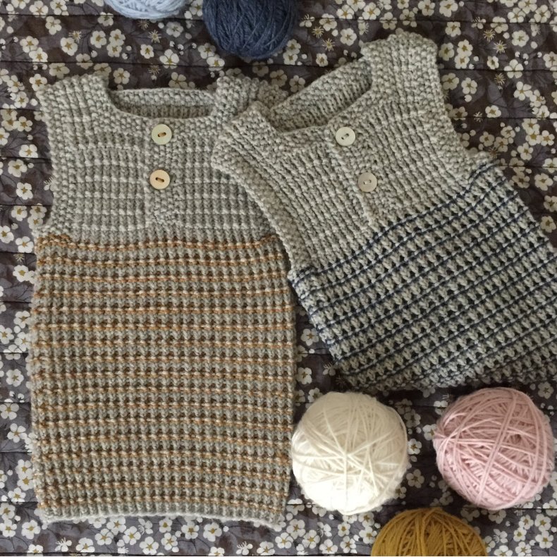 Enkel og klassisk babyvest strikket rundt nedefra og op til bærestykket i mønster og farveskifte. Bærestykket strikkes frem og tilbage. Vesten har et minimum af montering.